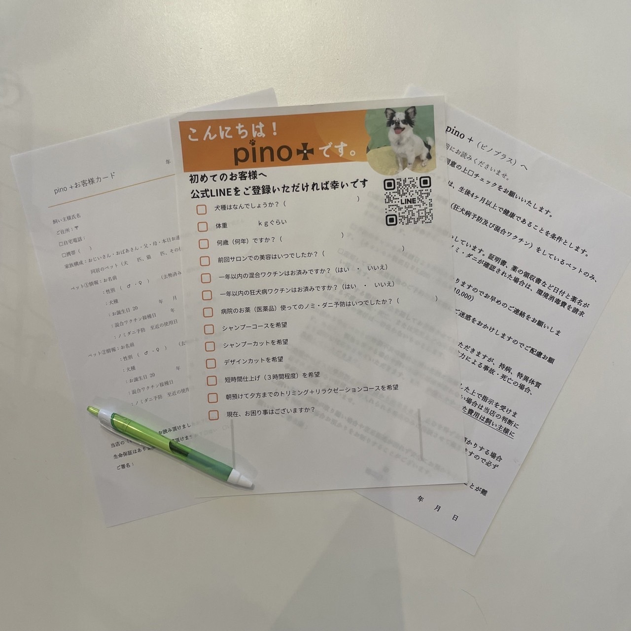 記入していただきます。わんちゃんの普段の様子、体調や皮膚、もつれの状態など丁寧にお伺いさせていただきます。