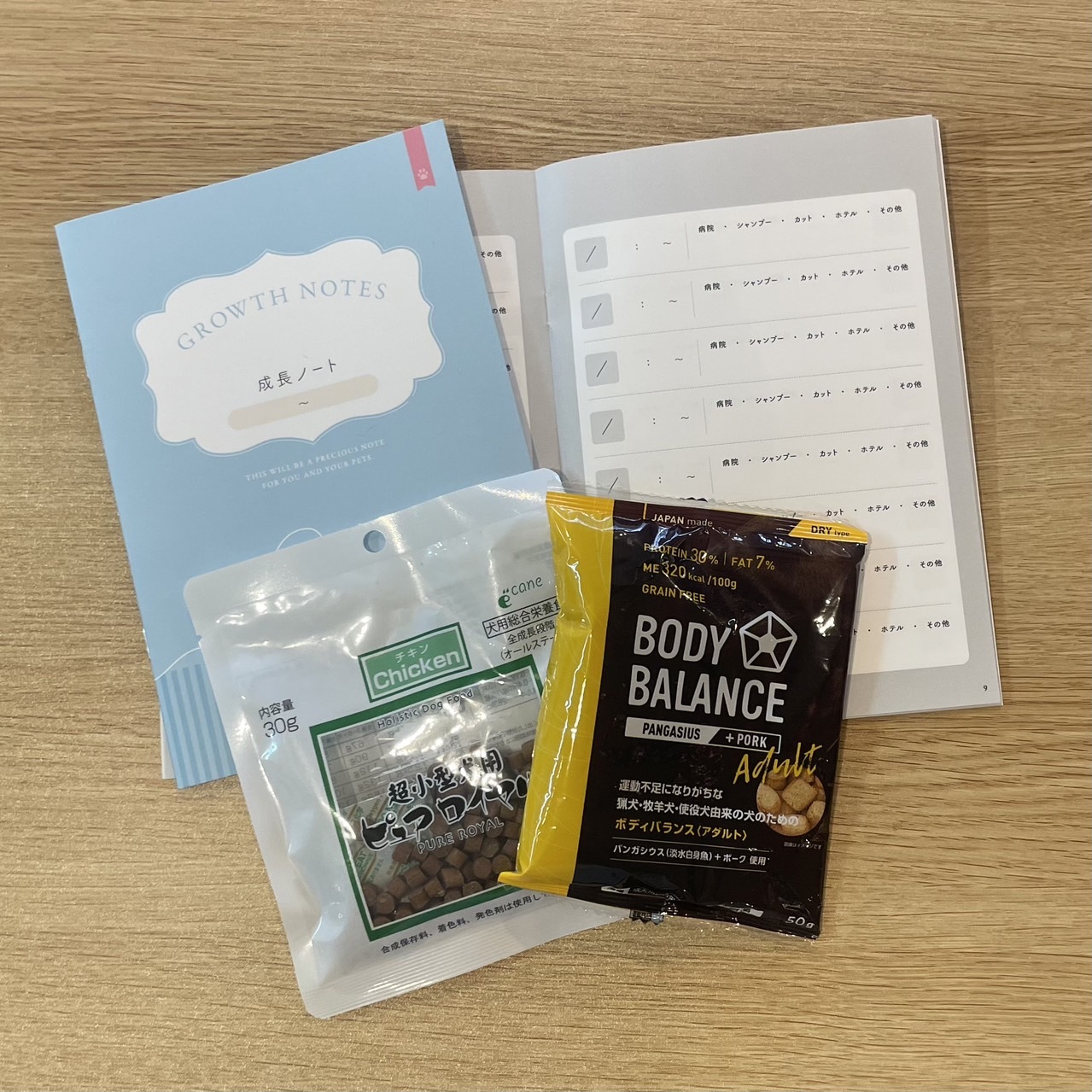 ポーチにはおすすめ商品のチラシやフードやおやつのサンプル、ノートにはその日のわんちゃんの記録を記入します。